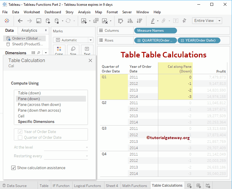 向下窗格计算将从窗格或组的第一行计算到最后一行。根据下图,First 函数适用于每个季度。