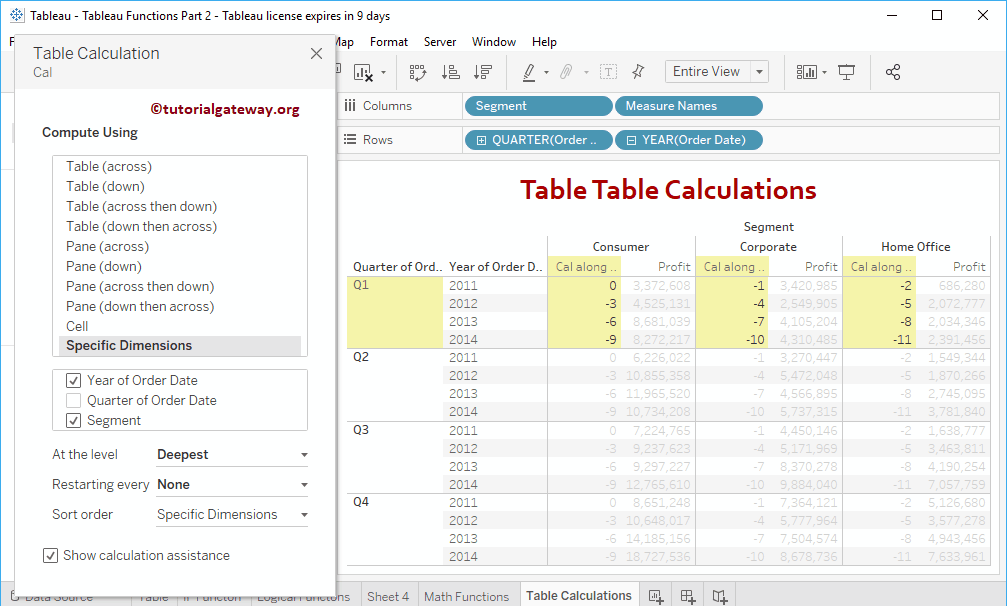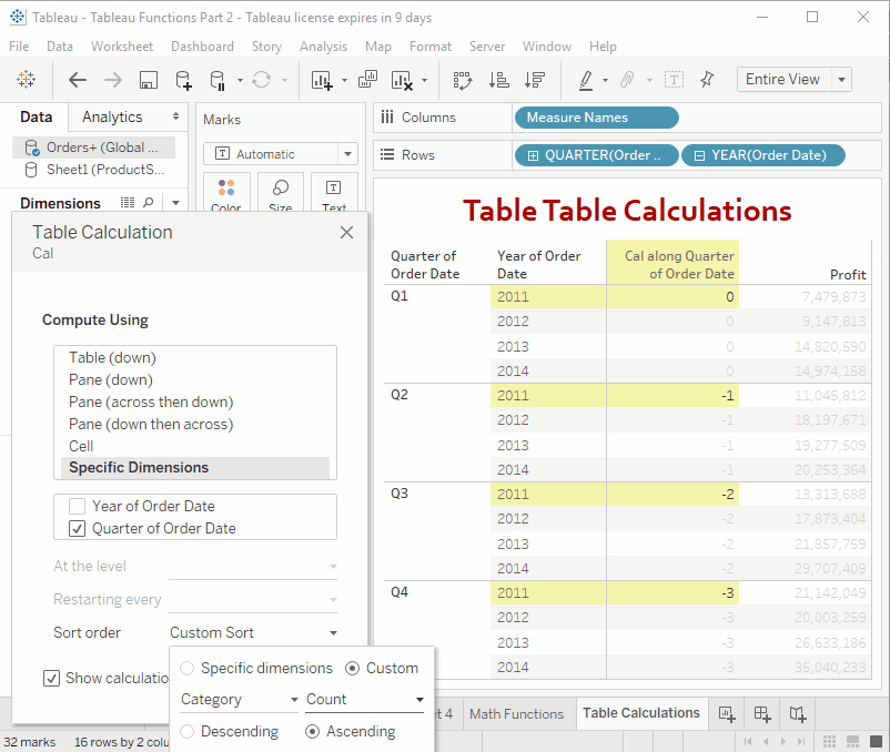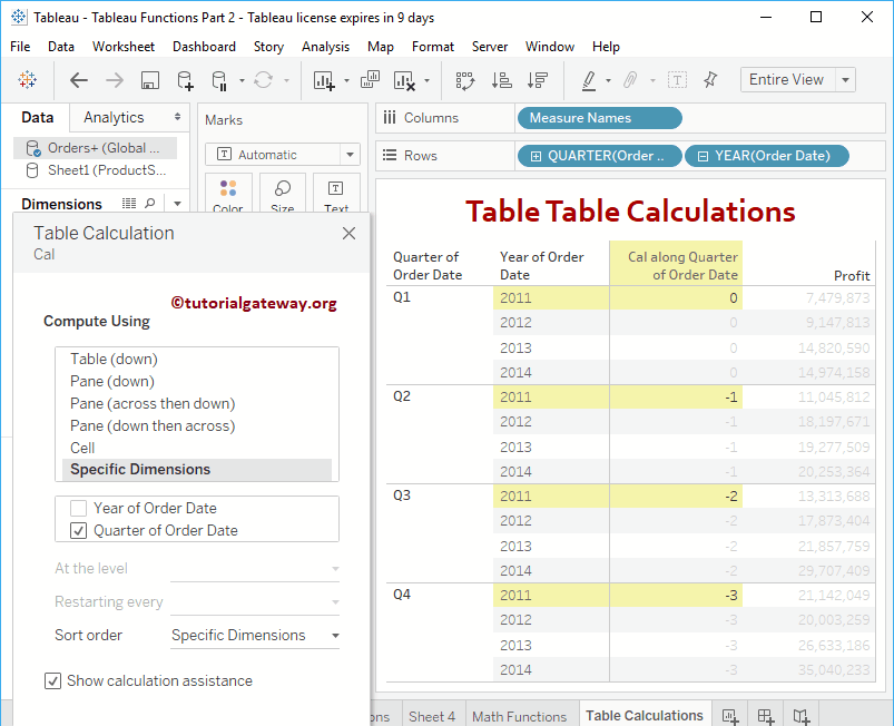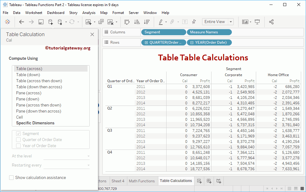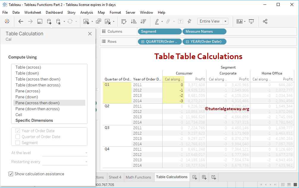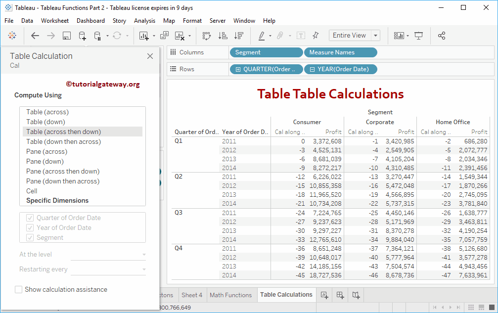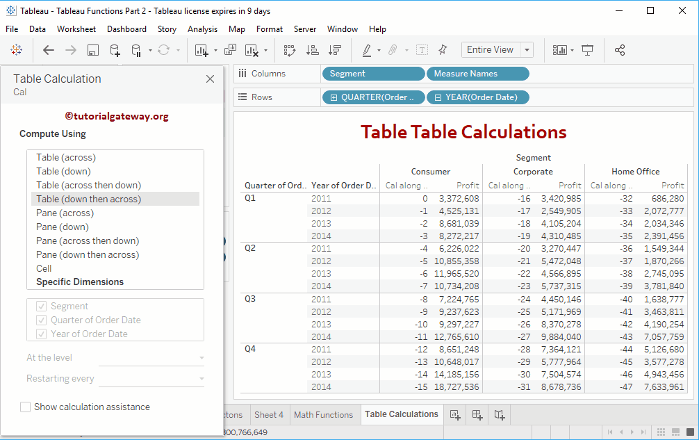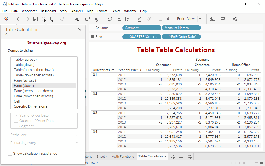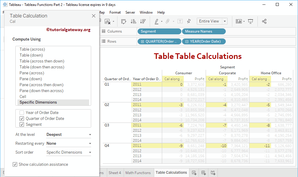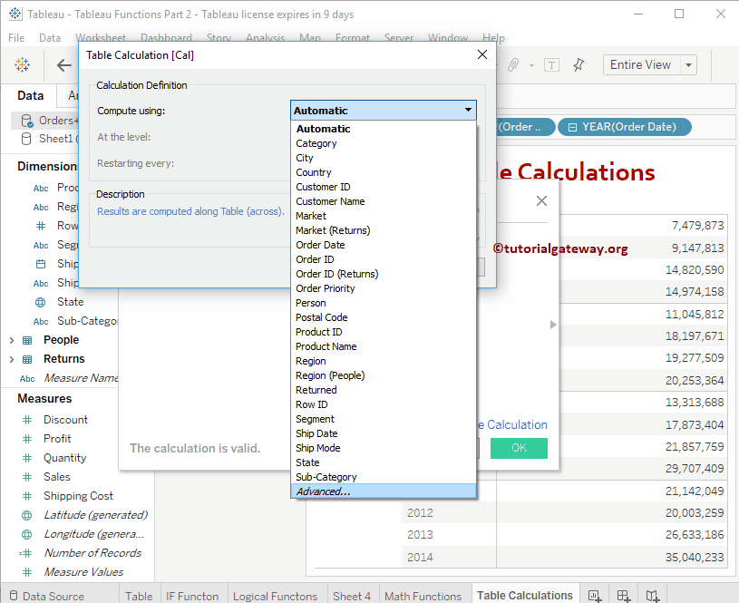 使用此窗口更改 Tableau 表格计算字段、级别等。我不喜欢通过此窗口进行任何修改。但是,您可以通过从“计算依据”下拉菜单中选择列来完成。我将单击“取消”按钮关闭窗口,然后单击“确定”。