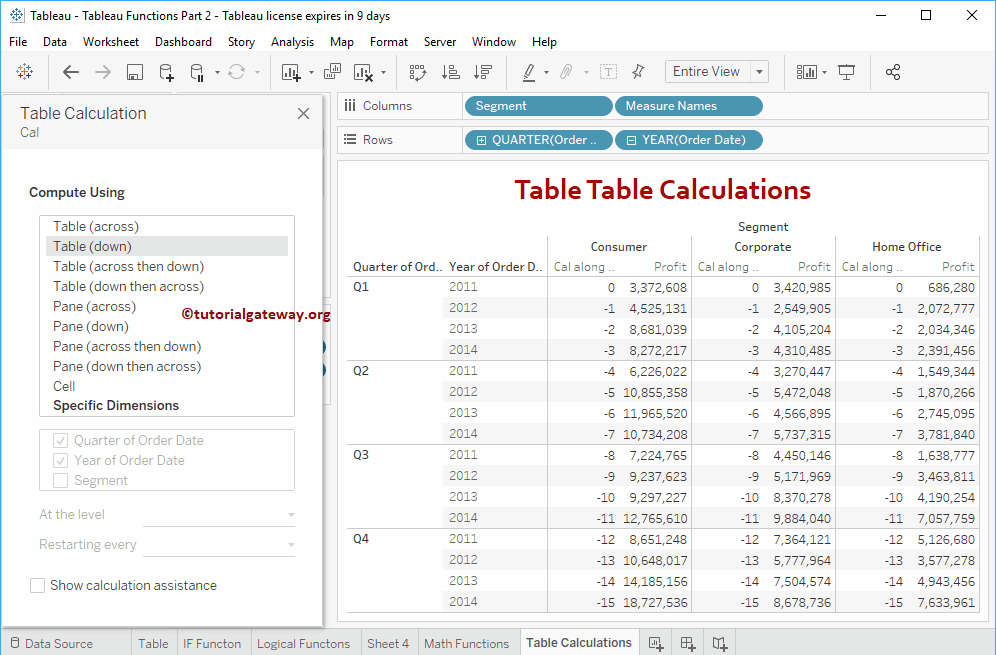修改或编辑 Tableau 表格计算非常简单。单击向下箭头,然后选择“计算依据”以更改计算选项。