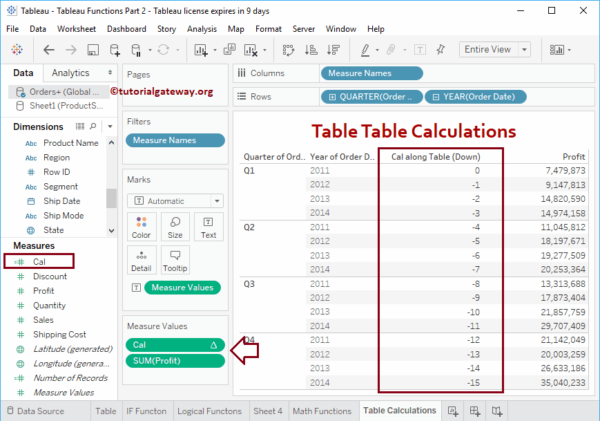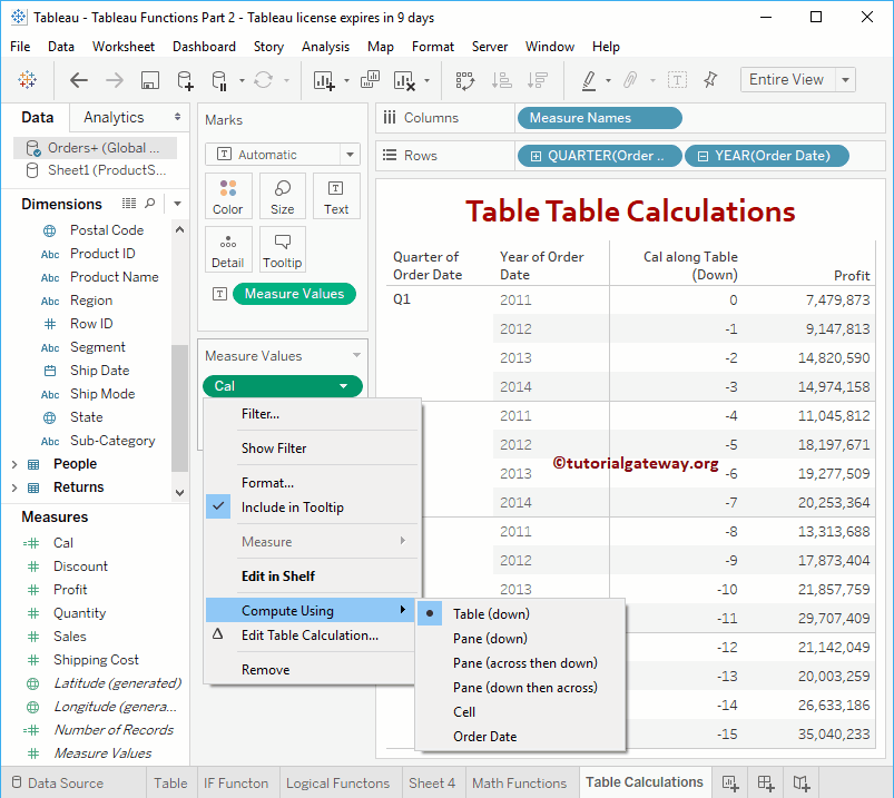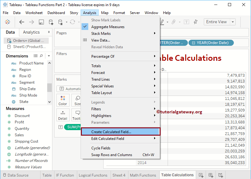 在此工具中,您可以通过多种方式创建表格计算。第一种方法是右键单击度量值,然后选择“创建”->“计算字段”。第二种方法,请导航到“分析”选项卡,然后选择“创建计算字段…”选项。请参考 Tableau 中的 Tab 报表、计算字段 和 连接到 Excel 文件。
