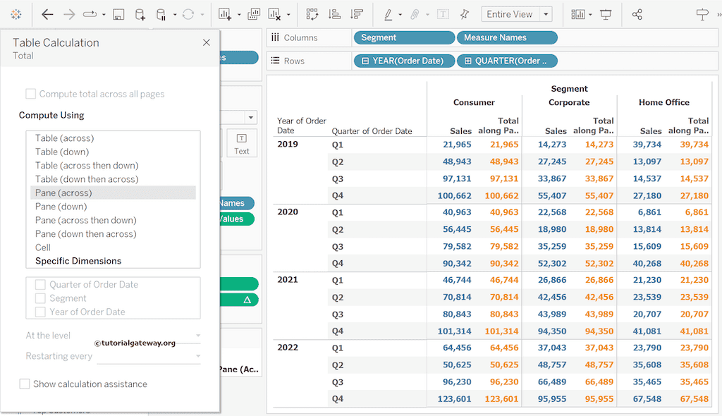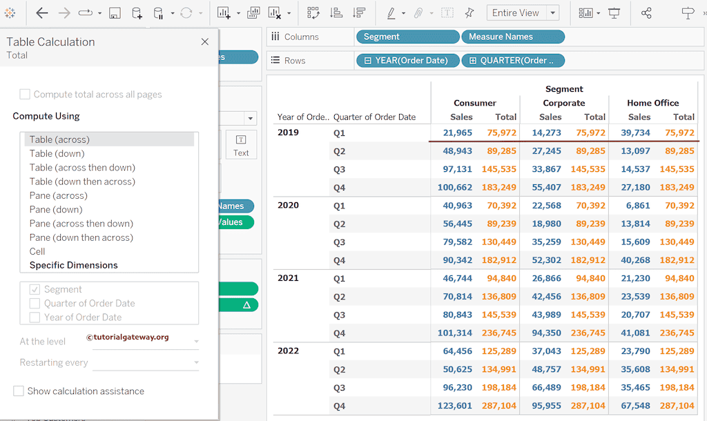我将其更改为“Table(across)”(沿表格计算)。它将显示所有细分市场的每个季度的总销售额。Q1 = 21,965 + 14,273 + 39,734 = 75,972。