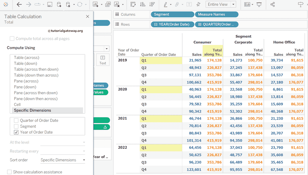 如果您选择“Compute Using”(计算方式)选项为“Specific Dimension”(特定维度),并且该维度是“Year of Order date”(订单日期的年份),它将计算每年的 Q1 等的总计。