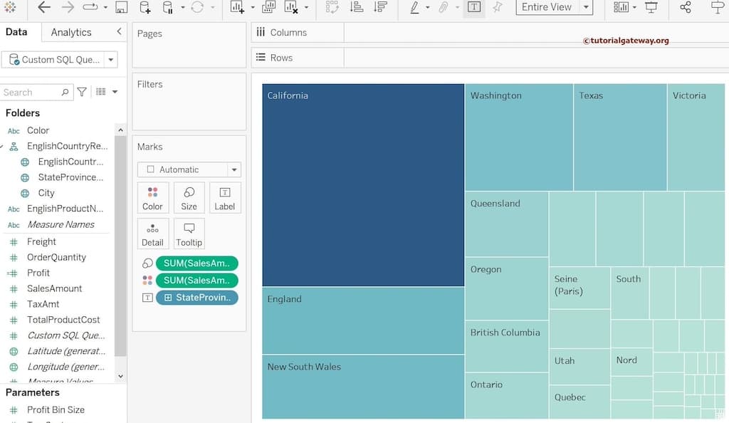 默认情况下,桌面会显示 Tableau 树状图,其中“州”名称为矩形文本字段,“销售额总计”为框大小。正如您所观察到的,加州州框比其他州框大,因为其销售额高于其他州。