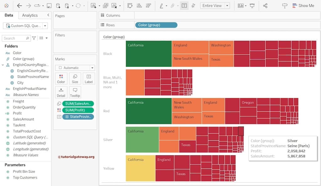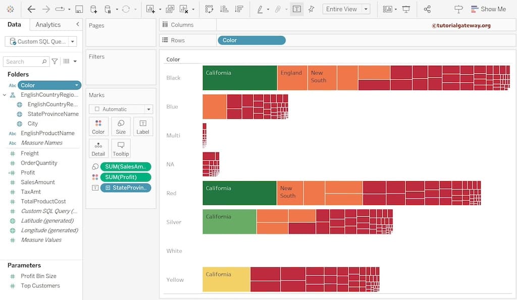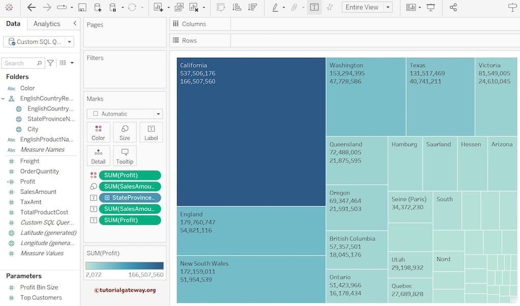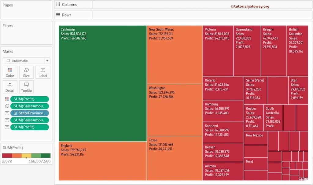 让我们也将“销售额”和“利润”值添加到树状图的文本字段。您可以看到州名称以及销售额和利润。为此,请将“销售额”和“利润”从度量区域拖到“标记”架中的“文本”字段。