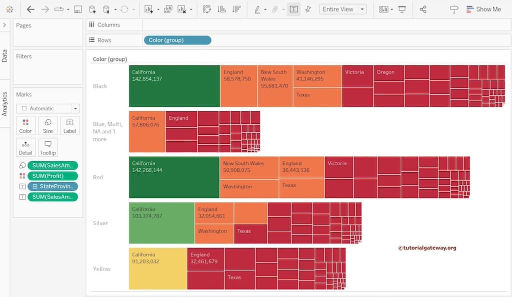 Tableau 不仅可以创建单个树状图,还可以创建多个树状图,如下所示。要实现此目的,请将“颜色”维度拖放到“行”架,并将“利润”添加到“颜色”架。