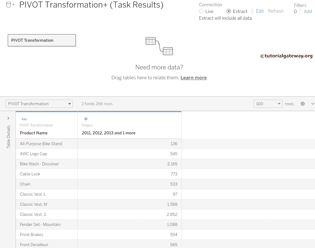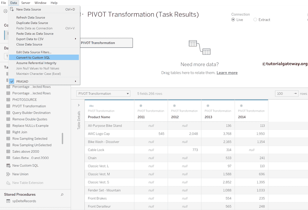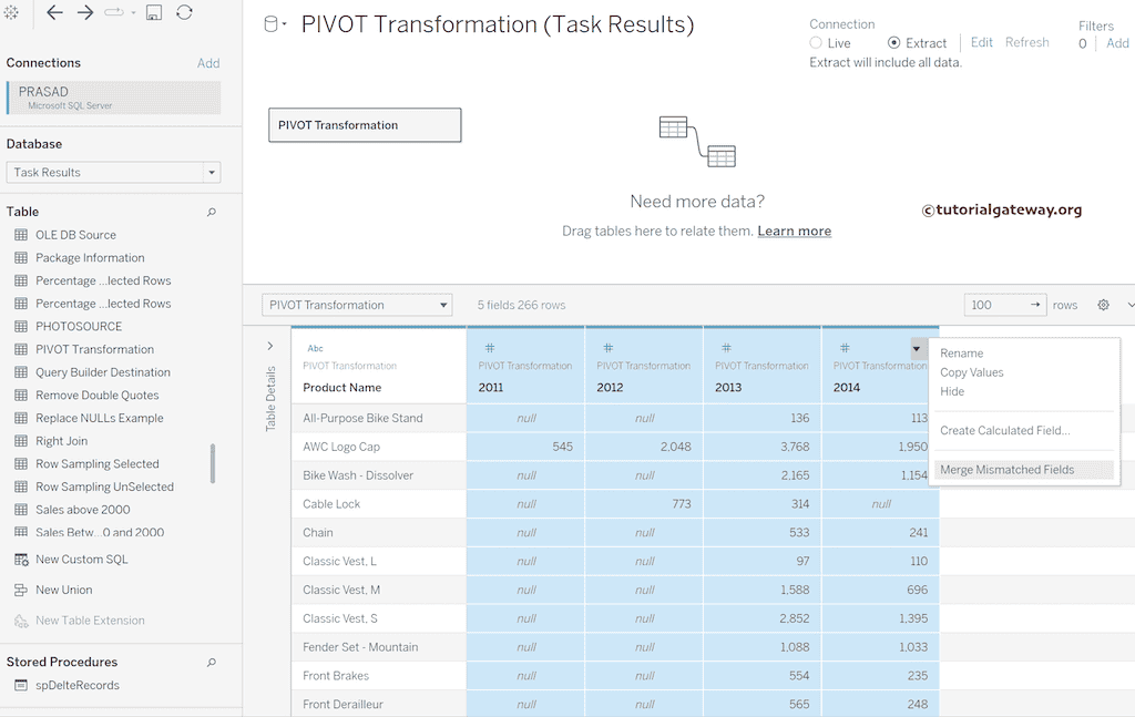 下面的截图将展示表中的数据,共有 266 条记录。首先,将 Tableau 连接到 Microsoft SQL Server。然后,从列表中选择所需的数据库。最后,拖放透视表以查看其中的数据。