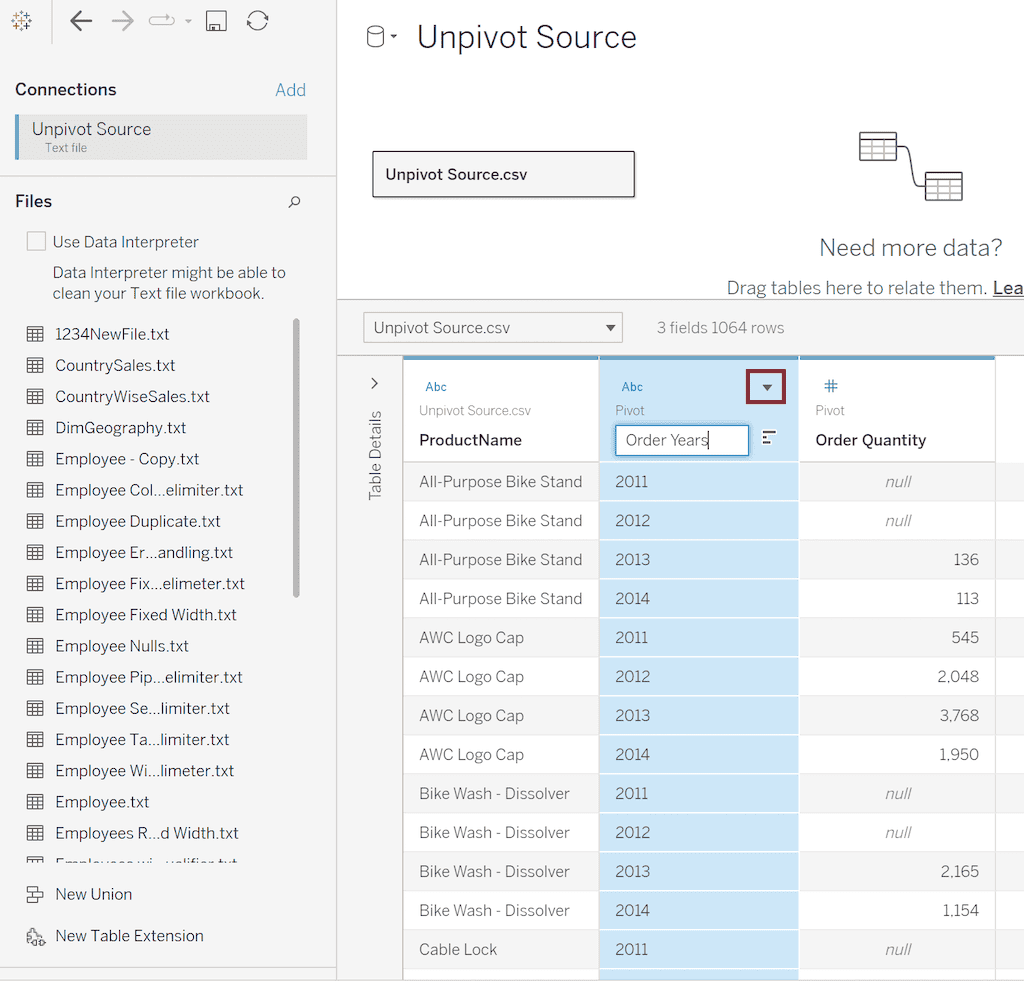 在这里,有一个透视选项可以将表列转换为逆透视数据。但是,此选项仅适用于文本、CSV 或 Excel 文件。对于数据库,您必须编写自己的自定义 SQL 查询。在本节中,我们将使用透视选项来执行逆透视表列。