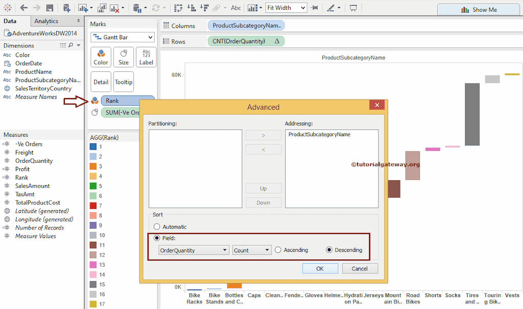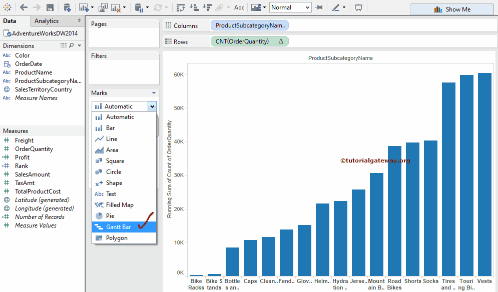 选择累计总计后,将显示以下屏幕截图,按升序排列。请将标记类型从“自动”更改为“甘特条”以创建 Tableau 瀑布图。为此,请选择“订单数量”的“标记类型”选项,然后选择“甘特条”以实现累积效果。