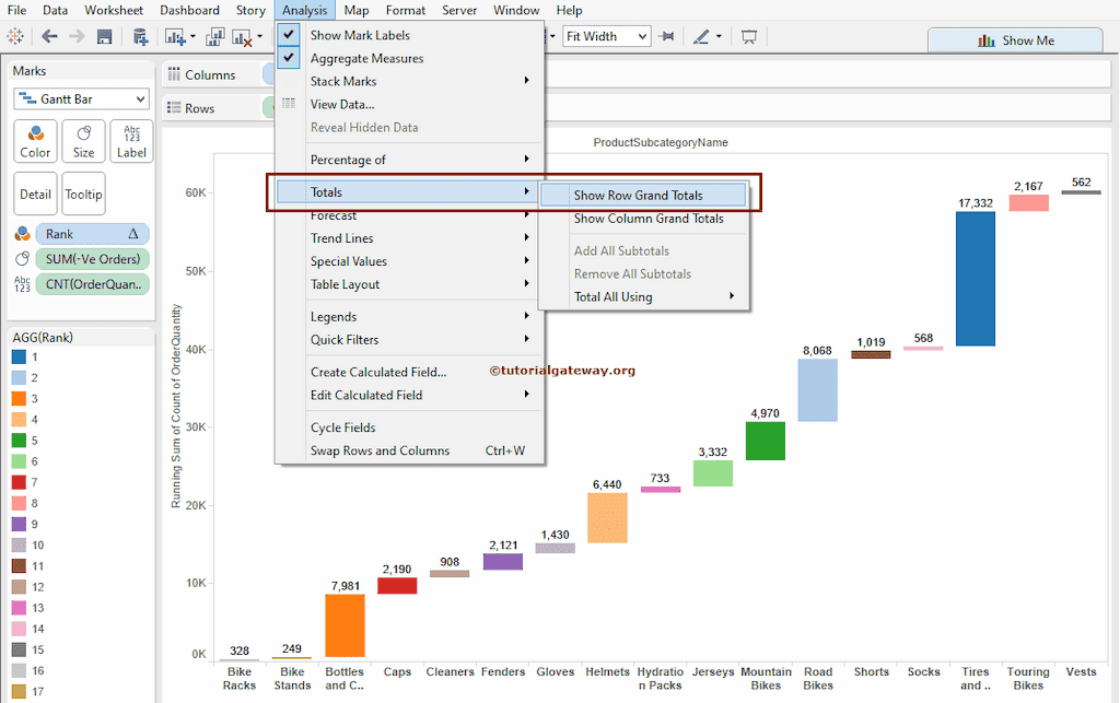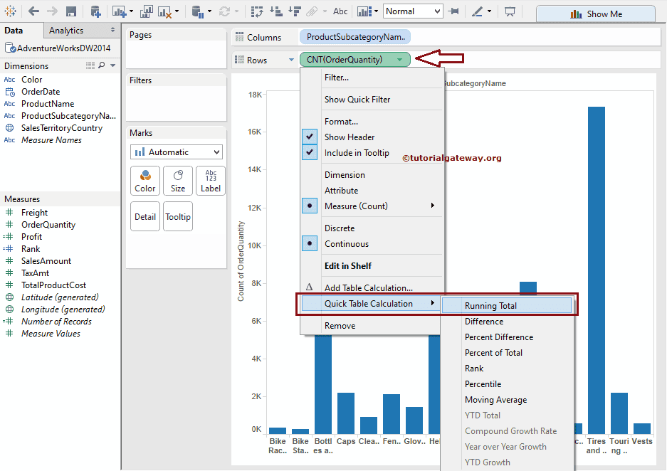 众所周知,Tableau 瀑布图是累计总计图的现代名称。因此,我们必须为上述指定的图表添加累计总计。请单击“行”功能区中的“订单数量”。接下来,选择“快速表计算”选项,然后选择“累计总计”。