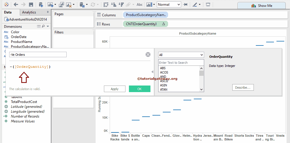 选择“创建 计算字段 ”选项后,将打开一个新窗口来编写或编辑表计算。对于下面的示例,我们需要订单数量的负值。因此,将以下表达式写为 表计算。有关更多图表 >> 单击此处。