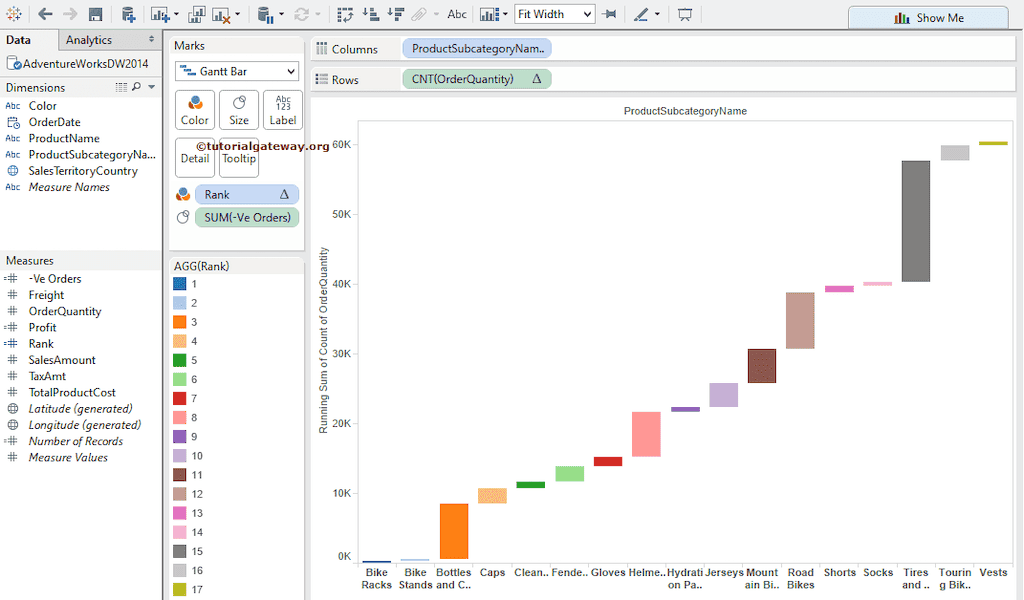 接下来,将新创建的计算字段(负订单)从“度量”区域拖放到“标记”卡中存在的“大小”字段。您可以看到我们的瀑布图。订单数量的负值的大小决定了甘特条单元格的大小。