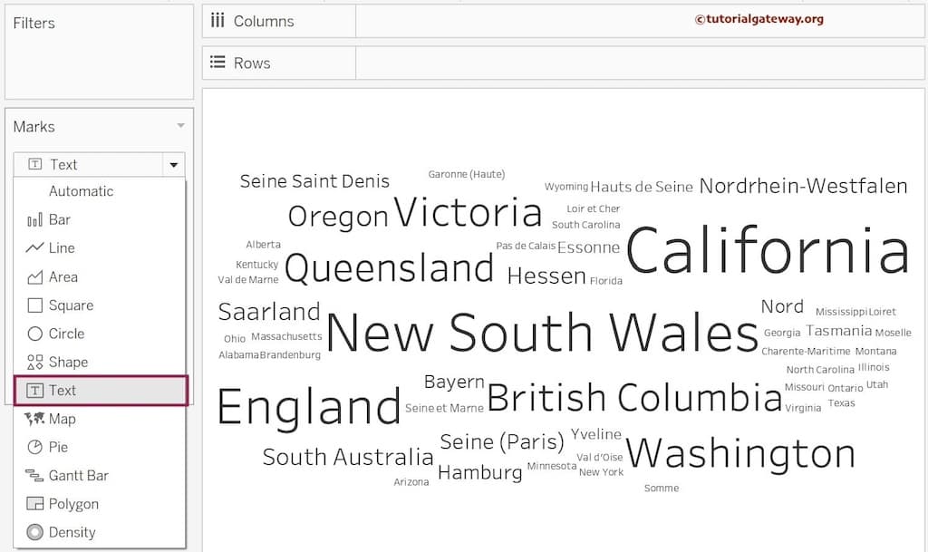 要创建 Tableau 词云,我们必须将字段添加到“文本”和“大小”架上。因此,将“州”(词)从“维度”区域拖放到“标记”卡中的“文本”字段,以查看此报告中可用的州名称。接下来,将“销售额”从“度量”区域拖放到“标记”卡中的“大小”字段。