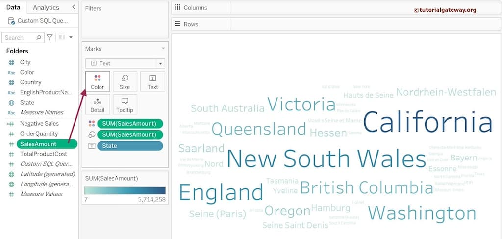 让我们为词云添加颜色。我们可以通过将“销售额”拖到“标记”卡中的“颜色”字段来完成此操作。