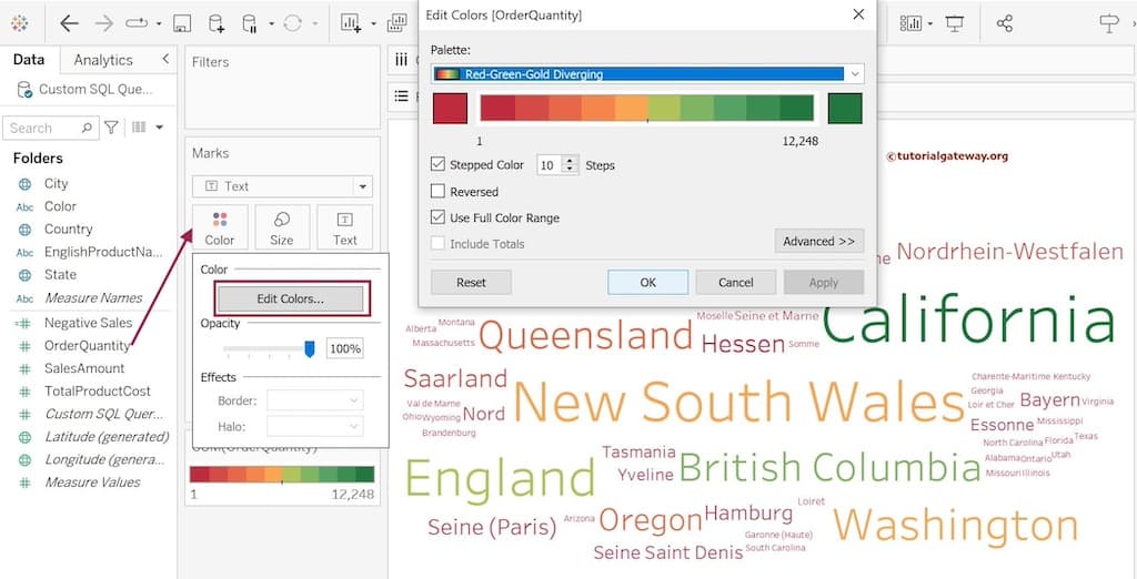 要更改词云颜色,我们将“颜色”架上的“销售额”替换为“订单数量总和”。现在,Tableau 词云将显示订单量最高的州名称填充为深蓝色,订单量最少的州名称填充为浅蓝色。接下来,单击“颜色”架并按“编辑颜色...”按钮来更改词云颜色。在此,我们选择了具有 10 个步骤的红-绿-金发散颜色。