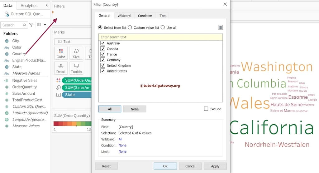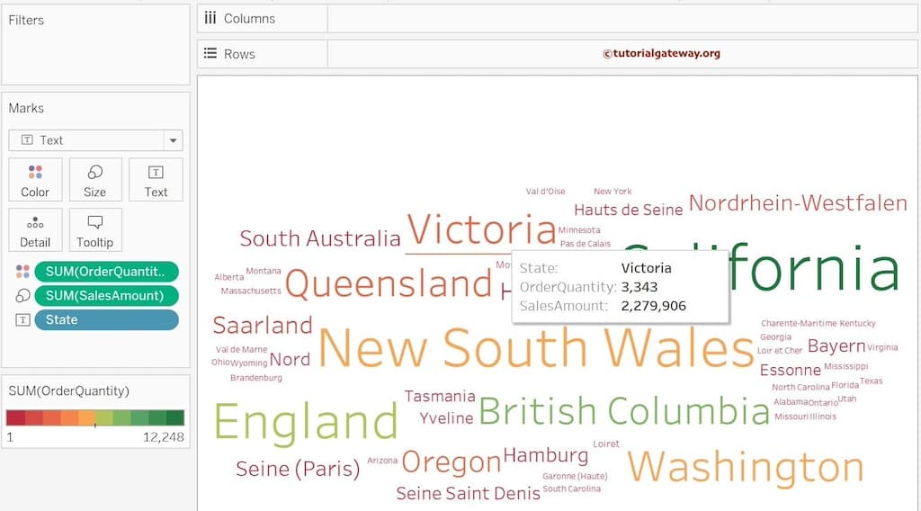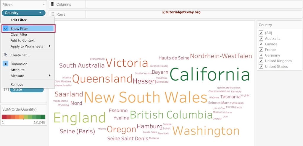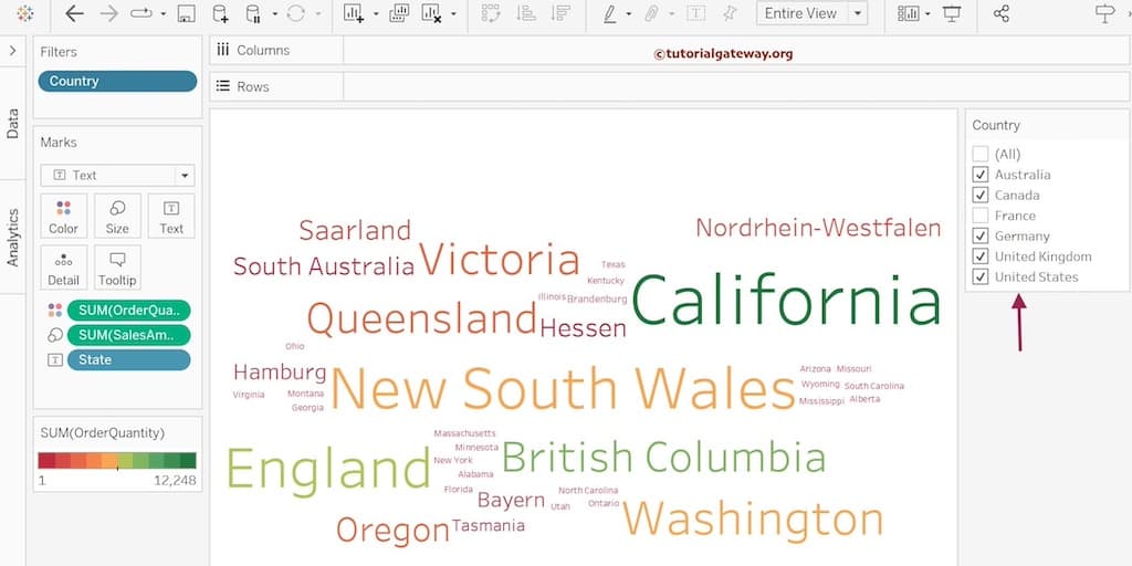 您可以选择或取消选择所需的国家/地区名称,这将在 Tableau 词云中得到反映。下面的屏幕截图显示了澳大利亚、加拿大、德国、美国和联合王国的州销售情况。您可以尝试取消勾选更多国家/地区。