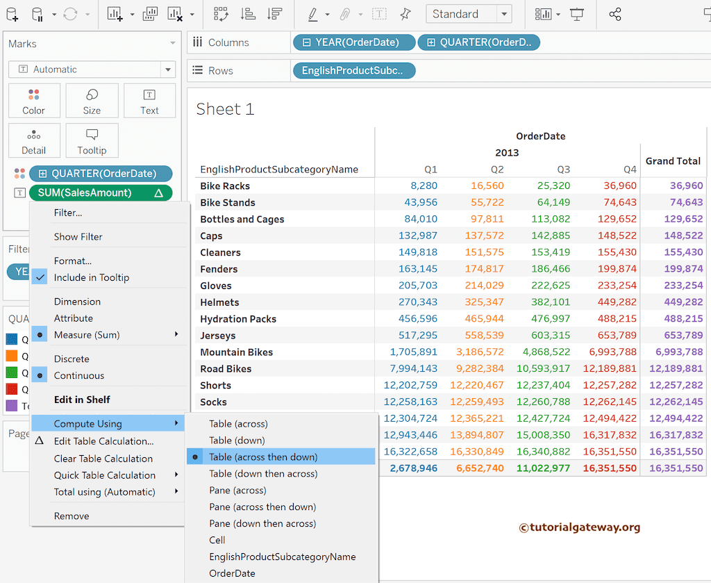 如果我们将其更改为“表横跨”,然后再“表向下”,它将连续地从自行车架 Q1 到 Q4 以及后续的产品子类别进行计算。例如,自行车支架 = 36,960 + 6,996