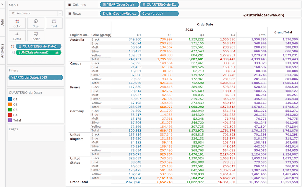 窗格横跨然后向下:Tableau 在表中计算每个国家的 YTD 总计。对于澳大利亚,它以黑色开始并计算所有季度的总计,然后转到蓝色,依此类推,直到黄色颜色的第四季度。它再次为加拿大重新开始。