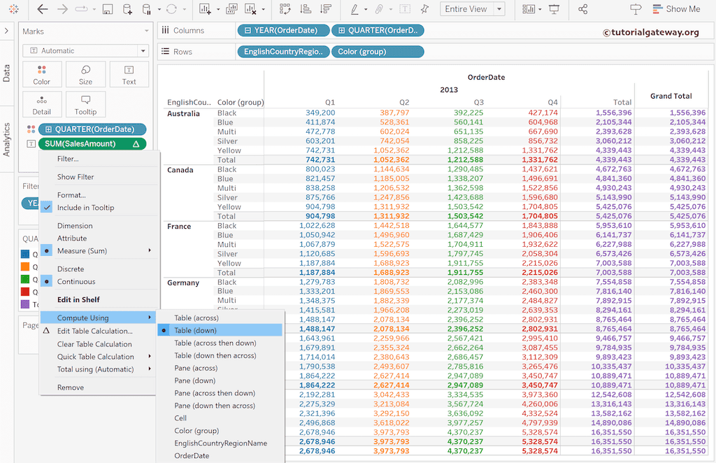 将计算更改为“表(向下)”。它会计算每个季度的 YTD 总计,而与颜色组和国家/地区无关。