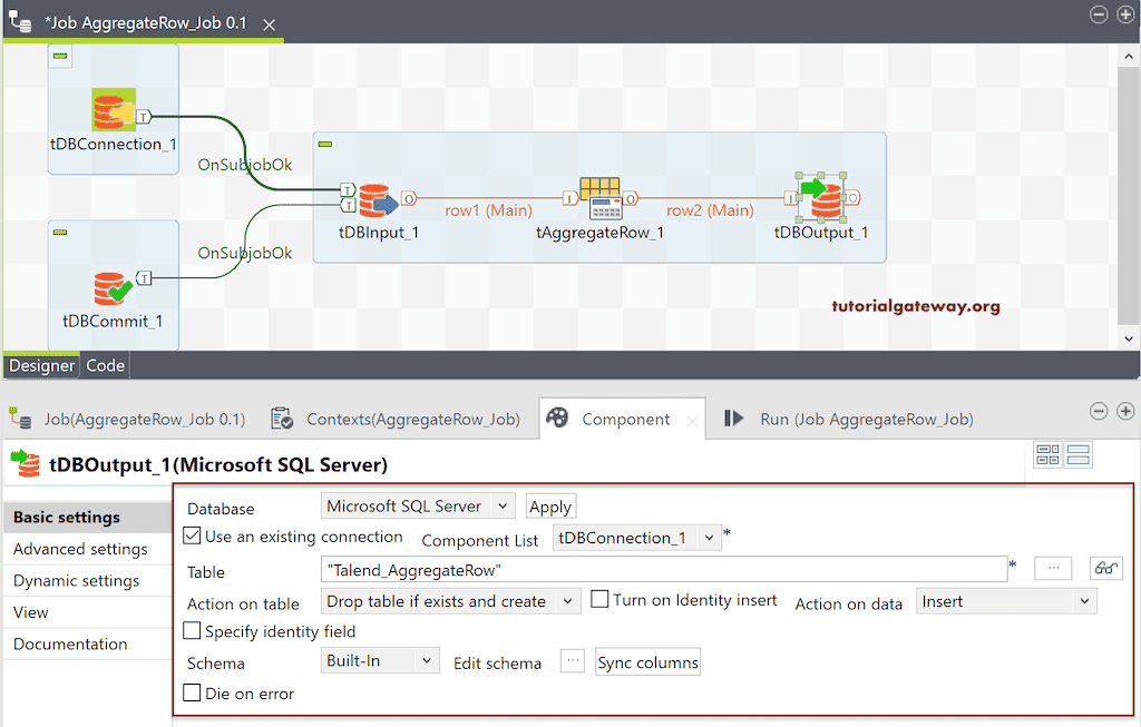 完成 tAggregateRow 配置后,我们将使用 DBOutput 将聚合行输出保存在 SQL 数据库中。在这里,我们将 Talend_tAggregateRow 表创建为目标表。