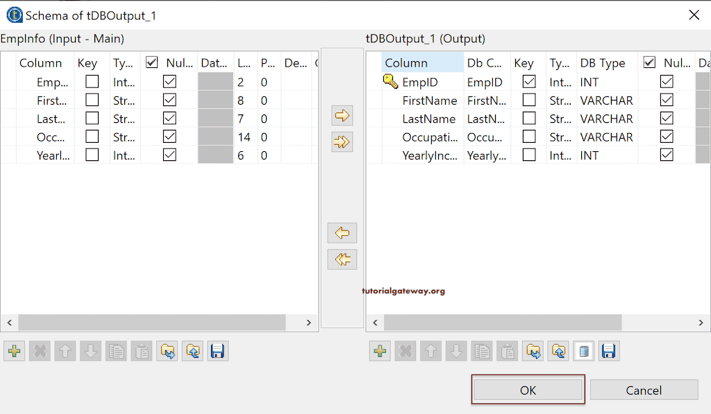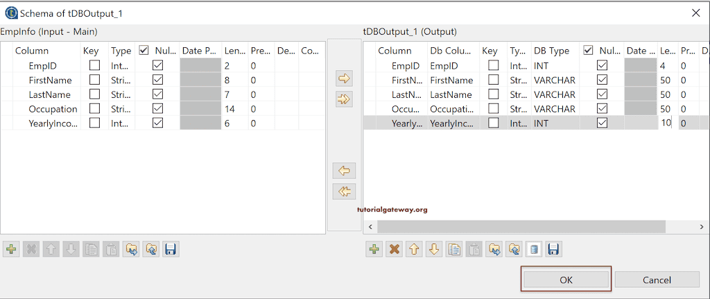 通过点击“同步列”按钮旁边的“编辑模式”按钮,将打开以下窗口。请检查并更改 `tDBOutput` 列的数据库类型、长度和精度。我们已更改了所有 `tDBOutput` 列的长度。