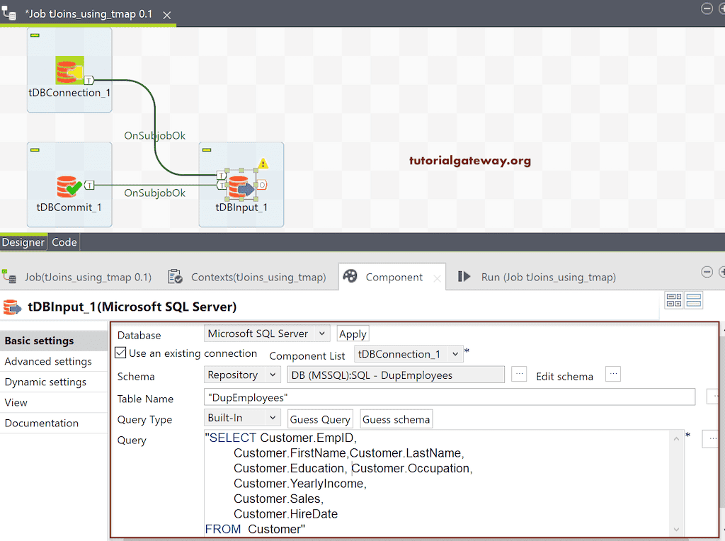在此 tMap 连接示例中,拖放 DBConnection 和 tDBCommit 以建立到 SQL 的连接并关闭它。接下来,我们使用 tDBInput 从 Talend 存储库中选择 DupEmployees 表。