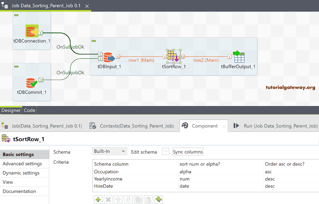 在这里,我们添加了 tAggregateSortedRow 并将其连接到 Talend tRunJob。通常,tAggregateSortedRow 需要排序数据,而我们的子作业使用 tSortRow 组件对这些行进行了排序。在 tAggregateSortedRow 中,我们按职业对列进行了分组并执行了一些聚合。