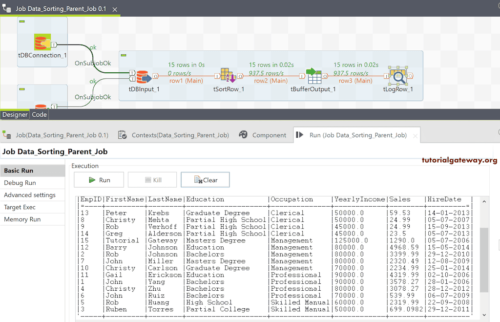 为了演示 Talend tRunJob,我们使用了之前创建的 tSortRow 示例。在这里,我们使用 tDBInput 选择客户表,并使用 tSortRow 按以下顺序对记录进行排序。我们没有将输出保存在表中,而是使用 tBufferOutput 来缓冲数据。