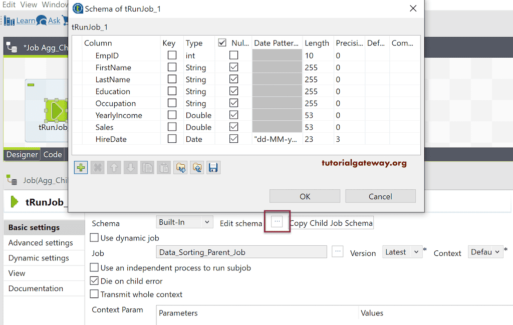 以下屏幕截图显示了可用选项。请单击“浏览作业” (…) 按钮以选择先前设计的作业。在此,我们选择了 Data_Sorting_Parent_Job。