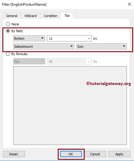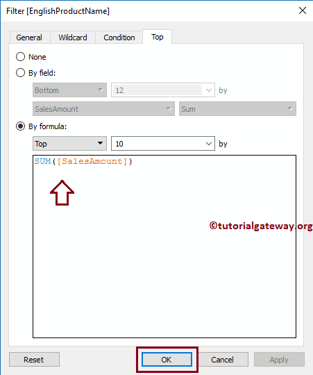 从下面的屏幕截图中,您可以观察到我们选择了“按公式”部分。接下来,我们添加了 SUM([SalesAmount]) 代码作为公式。