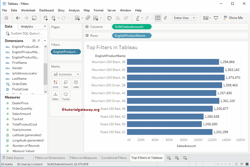 在此示例中,我们使用“前 10”筛选器根据销售额总和选择前 10 条记录。