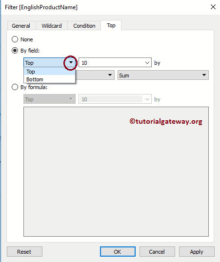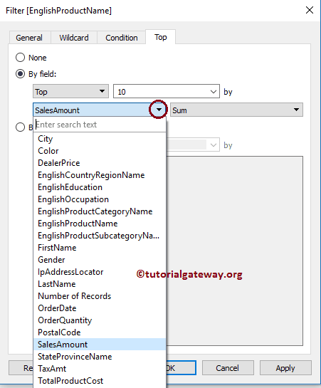 从下面的屏幕截图中,您可以观察到我们选择了“按字段”部分。接下来,我们选择“顶部”、“销售额”作为条件,以及“总和”作为聚合函数。最后,我们在文本框中添加了 10 个值。
