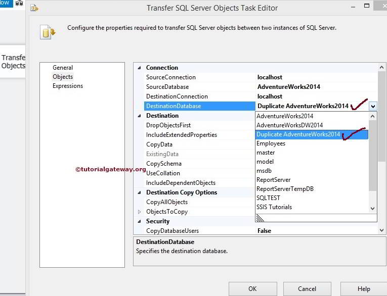 使用SSIS传输SQL Server对象任务,我们将把存储过程从[AdventureWorks2014]传输到[Duplicate AdventureWorks2014]。