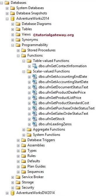 在开始创建 SSIS 传输 SQL Server 用户定义函数包之前,让我们先看看 [AdventureWorks2014] 中的函数。