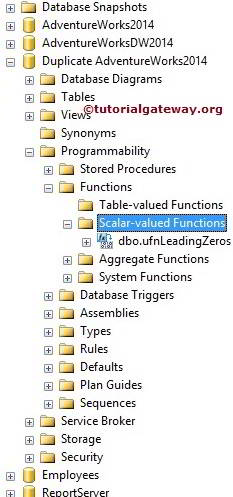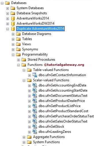 上面的屏幕截图显示 [Duplicate AdventureWorks2014] 数据库包含一个标量值函数。