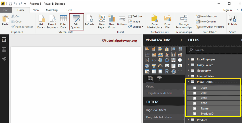 人们可能会混淆 Power BI 中透视表和取消透视表的区别?透视将行转换为列,而取消透视则相反;它将列转换为行。让我们通过一个示例看看如何创建取消透视表或如何转换透视表。请点击桌面“主页”选项卡下的“编辑查询”以创建或将透视表转换为取消透视表。