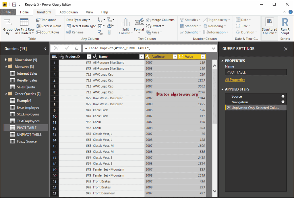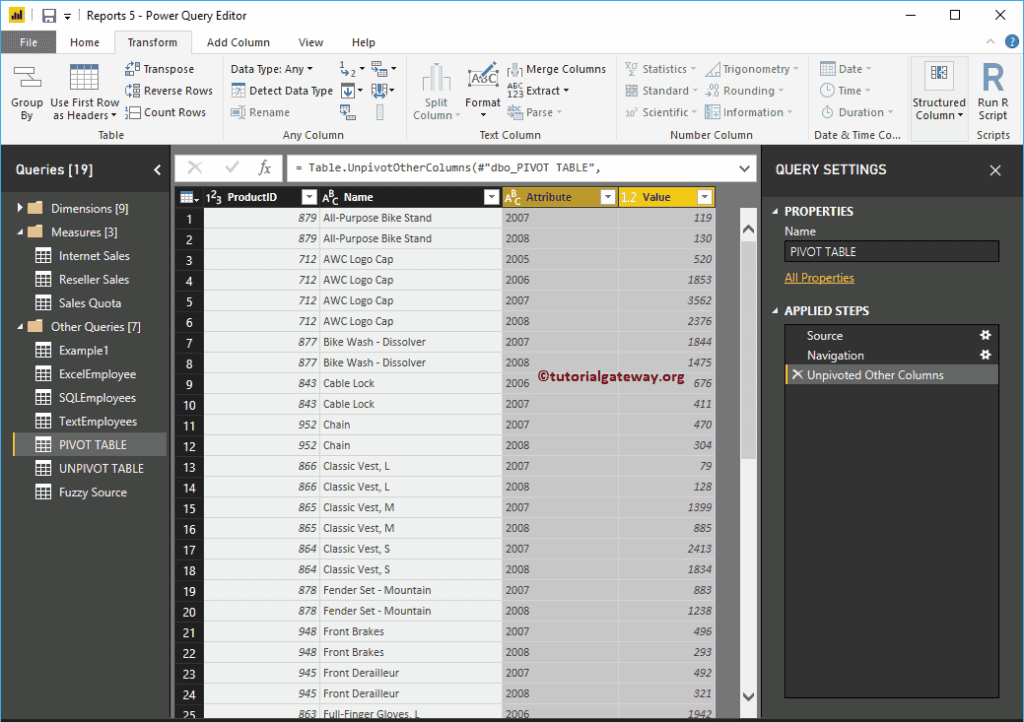 为了转换透视表,请转到“转换”选项卡。在此选项卡下,您可以找到“取消透视列”按钮,如下所示。