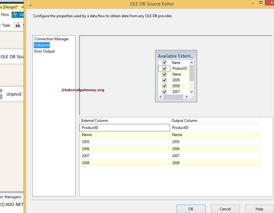 - 可用输入列 (Available Input Columns):通过勾选复选框选择要 UNPIVOT 的列。不要忘记为其余列选择“传递”(Pass Through) 选项。如果您错过了选择“传递”选项,这些列将无法用于目标。在此 SSIS 转换示例中,ProductID 和 Name 列是“传递”列,而 2005、2006、2007 和 2008 是我们要 UNPIVOT 的列。
