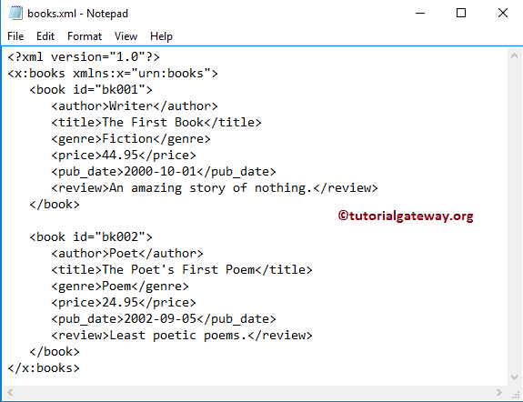如何使用 SSIS XML 任务验证 XML 文件(附示例)? 在我们开始示例之前,让我们看看本地文件系统目标文件夹中的数据。下面的屏幕截图显示了该 books.xml 文件中的数据。我们的任务是使用 SSIS XML 任务来验证此 XML 文件。
