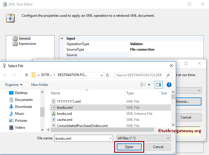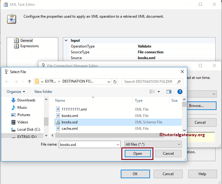 从下面的屏幕截图中可以看到,我们选择了目标文件夹中的 books.xsd 文件。