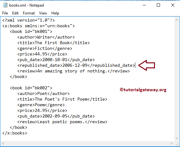 现在,让我们更改 books.xml 文件。从下面可以看到,我们为 book id bk001 添加了 <republished_date> 节点。