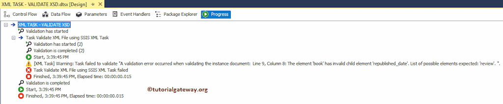 让我们重新运行 SSIS XML 任务以验证 XML 文件包。从下面的屏幕截图可以看到,我们的包失败了。