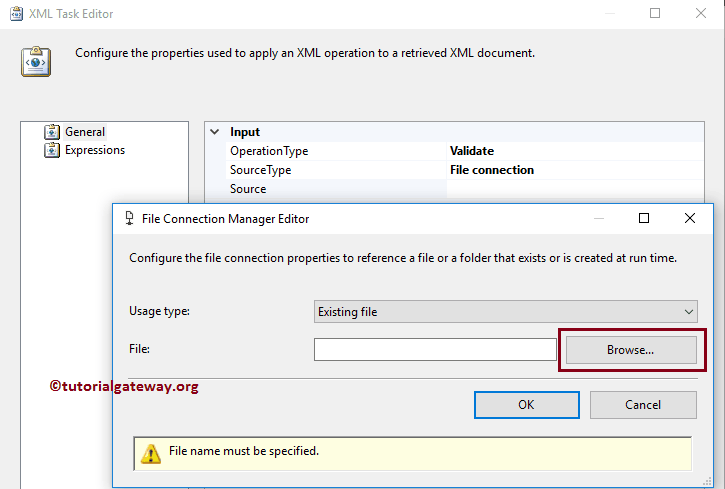 单击 <New Connection..> 选项后,将打开文件连接管理器编辑器进行配置。在本例中,我们要验证现有 XML 文件。因此,我们从 Usage Type 中选择 Existing File 选项。