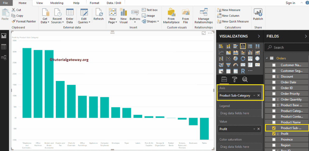 要创建瀑布图,首先,将“利润”从“字段”部分拖放到“画布”区域。它会自动创建一个列,如下所示。让我将“产品子类别”添加到“轴”部分。