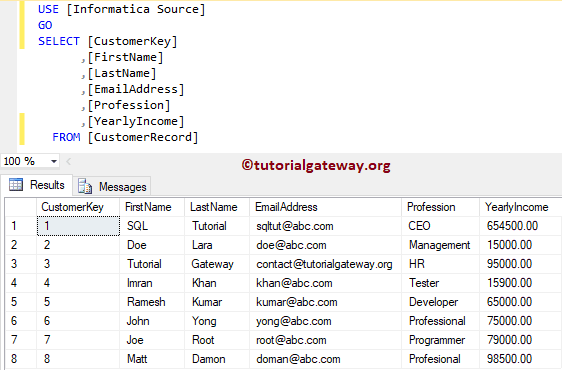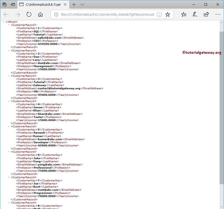 在本文中,我们将通过示例向您展示如何在 Informatica 中使用 XML 生成器转换来从数据库表中生成 XML 文件。对于这个 XML 生成器转换示例,我们将使用以下显示的数据(客户记录表)
