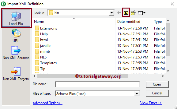 单击“创建..”按钮后,将如以下所示打开一个名为“导入 XML 定义”的新窗口。在这里,您需要为此 XML 文件指定 XSD 或 XML 定义。