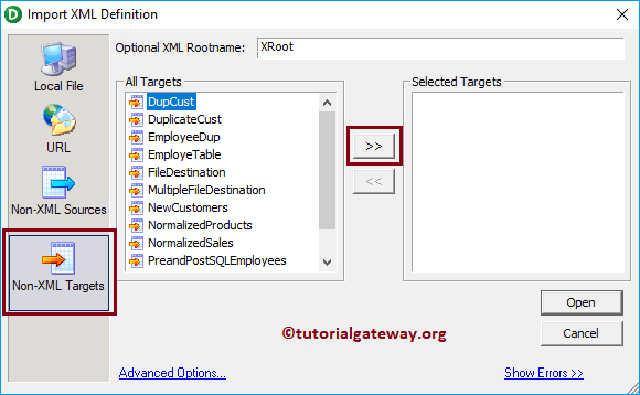第一种方法——请导航到目标设计器以定义 XML 生成器转换目标。在此示例中,我们的任务是创建 XML 文件。因此,转到“目标”菜单并选择“导入 XML 定义”选项。通过此操作,您可以将 XML 定义定义在目标定义中。