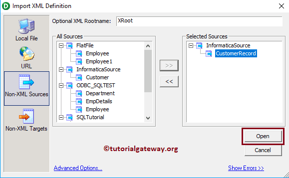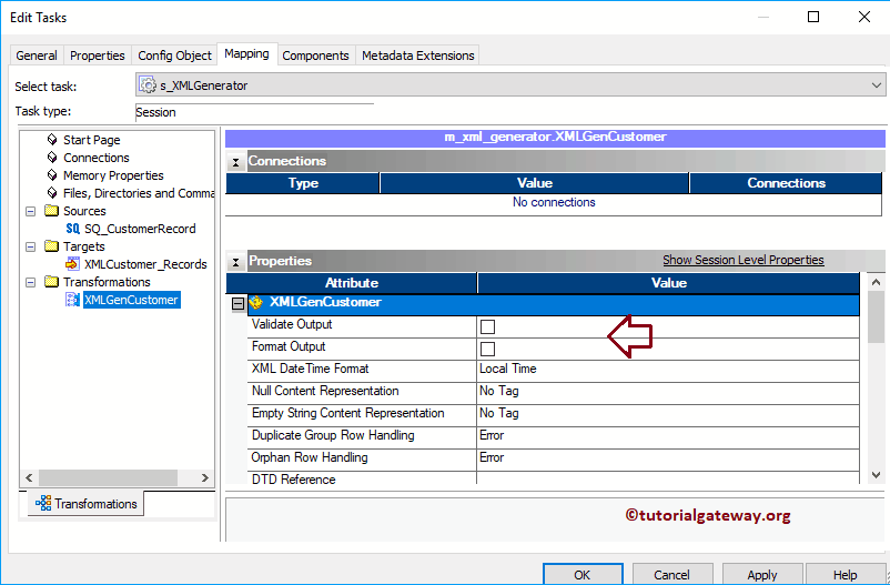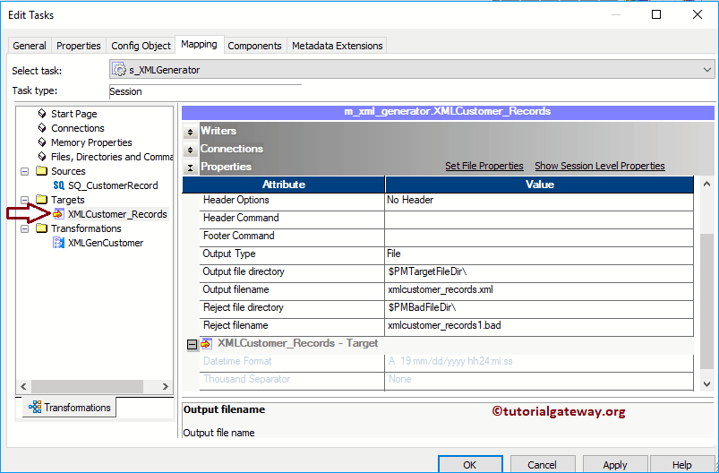 现在,我们需要配置目标连接。因此,让我们通过单击“目标”文件夹中的 XMLCustomer_Records 来配置目标连接。