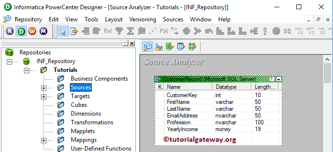 将 Customer 记录源定义从“源”文件夹拖放到映射设计器。拖放源后,Power Center 设计器将自动为您创建源限定符。我建议您参考源限定符转换文章。