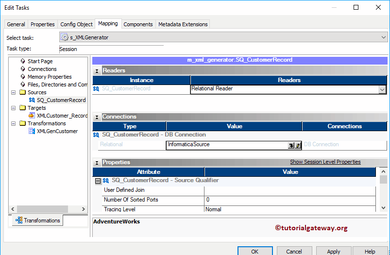 双击会话任务将打开“编辑任务”窗口。在“映射”选项卡中,我们需要配置源和目标连接。首先,让我们通过单击“源”文件夹中的 SQ_CustomerRecord 源来配置源连接。