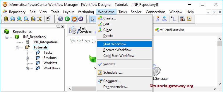 现在,让我通过在“工作流”菜单中选择“启动工作流”选项来启动 Informatica XML 生成器转换工作流。
